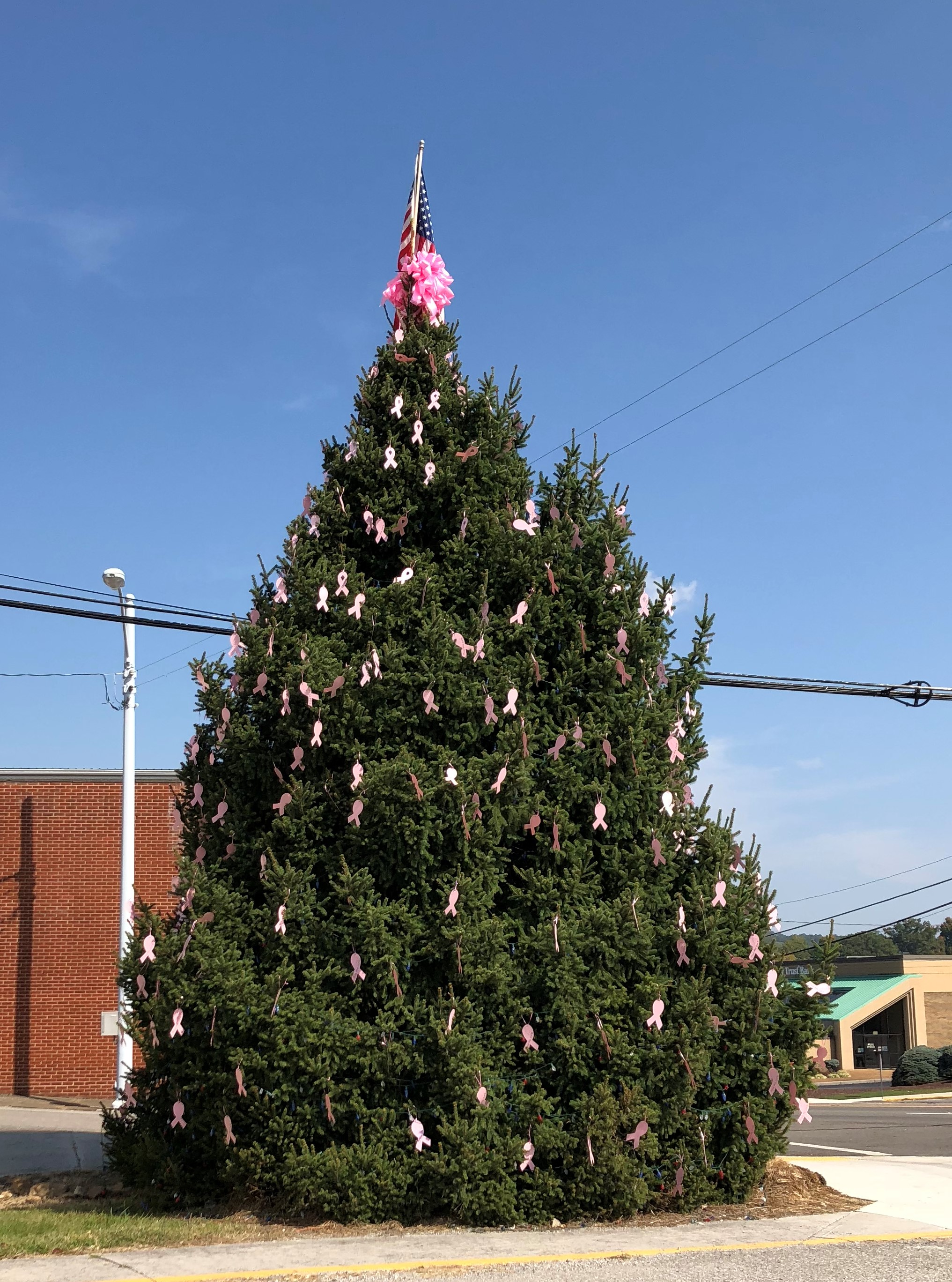 TOP PHOTO:  The big pink bow sits atop the tree with the US Flag as tiny pink ribbons dot the tree.