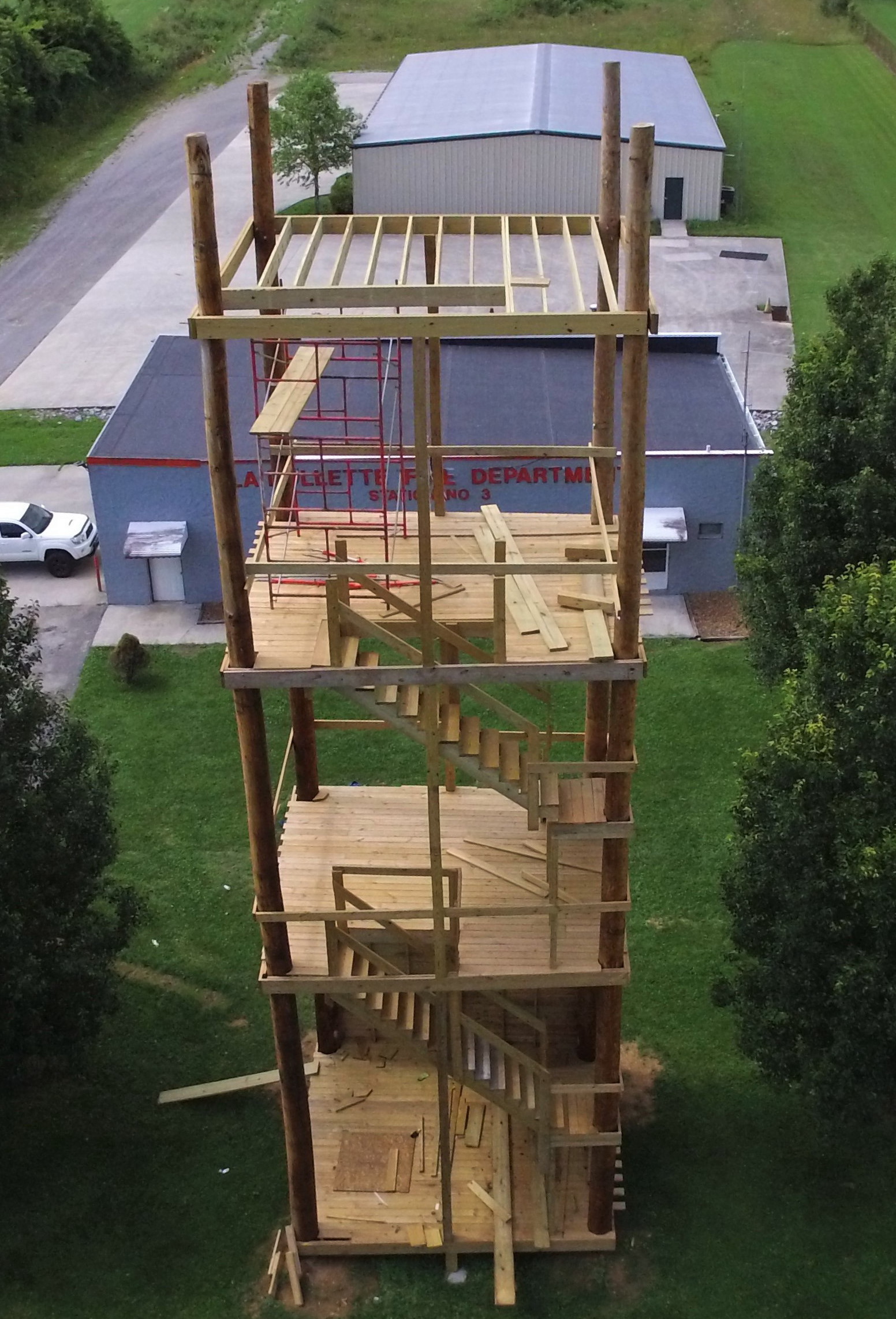 LAFOLLETTE, TN (WLAF) – WLAF’s Charlie Hutson, Lindsey Hutson and Eagle I share an up high and close look at the new La Follette Fire Department’s Training Tower.LFD Lieutenent Johnny Seal said, “This will be the last floor, and there will be safety railing added along with cabling that will be used to tie off to while training.” A top/roof is expected to be added in the near future.