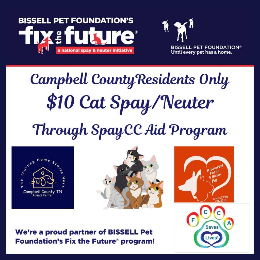 CAMPBELL COUNTY, TN (SPECIAL TO WLAF)- Through a collaboration of the Bissell Pet Foundation, Spay Campbell County Tennessee Pets, Friends of Campbell County TN Animals and the Campbell County Public Spay/Neuter Clinic, Campbell County residents can get their cats fixed for $10, includes spay/neuter service, 1 year rabies vaccination, HCP vaccination and either microchip or ear tipping.