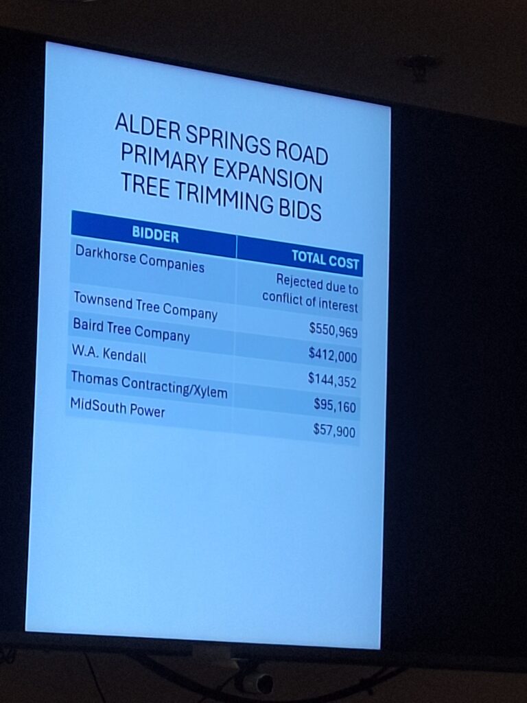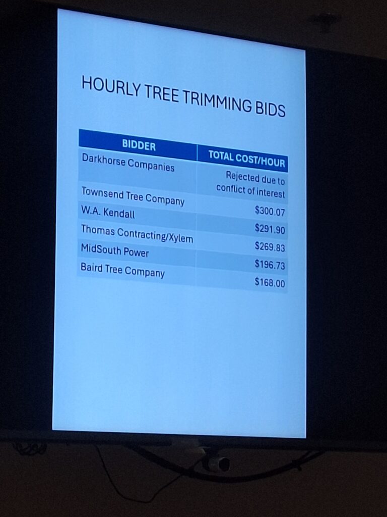 The utility received six bids, with the highest coming from Townsend Tree Company at $550,969. Midsouth Power was the lowest at $57,900 and was approved by the board. One bid, Darkhorse Companies was “rejected due to a conflict of interest.”