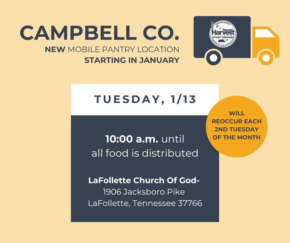 LAFOLLETTE, TN (WLAF)- Coming in January, Second Harvest Food Bank will be adding a new Mobile Pantry location in Campbell County at the LaFollette Church of God. The first distribution day is Tuesday, January 13, at 10:00am. Organizers are asking people to “please arrive when the distribution starts, rather than before the start time.” Participants must bring a photo ID. The food distribution will be in a drive-thru style format.