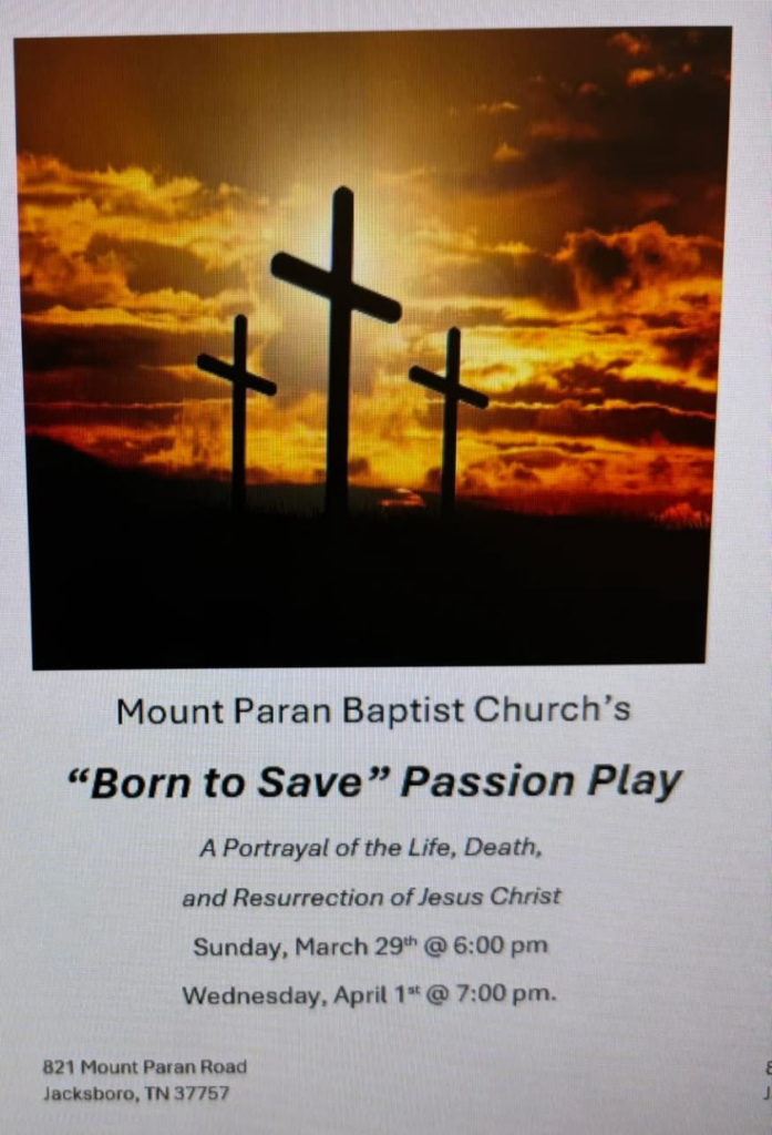 Easter play begins at 6:00 p.m. on Sunday, March 29th. at Davis Chapel Community Baptist Church & everyone is invited to attend. Church is located on Carr Wynn Road.