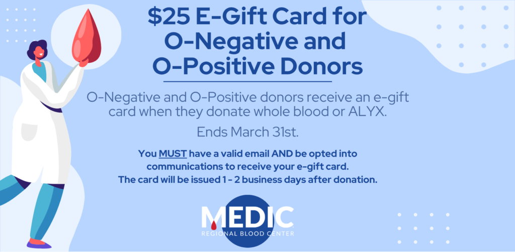 WHAT: Low Inventory – O Positive and O Negative Blood Types, Critically Low Inventory – B Negative Blood Type, O Positive, O Negative, and B Negative whole blood and ALYX donors will receive $25 e-gift cards for their successful donation.