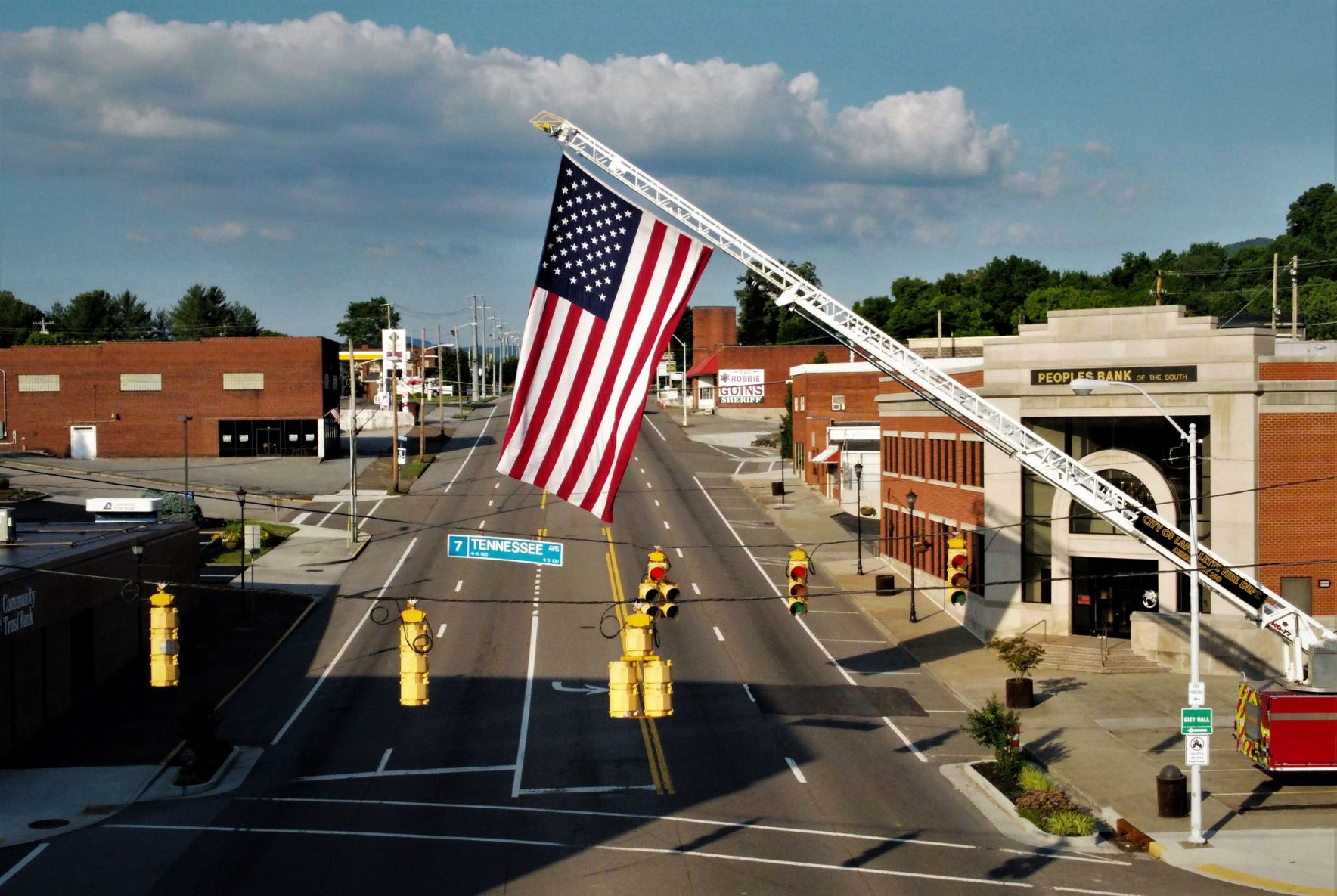 TOP PHOTO: The La Follette Fire Department continues its tradition of showcasing Old Glory on Memorial Day from the Peoples Bank parking lot in Downtown La Follette.