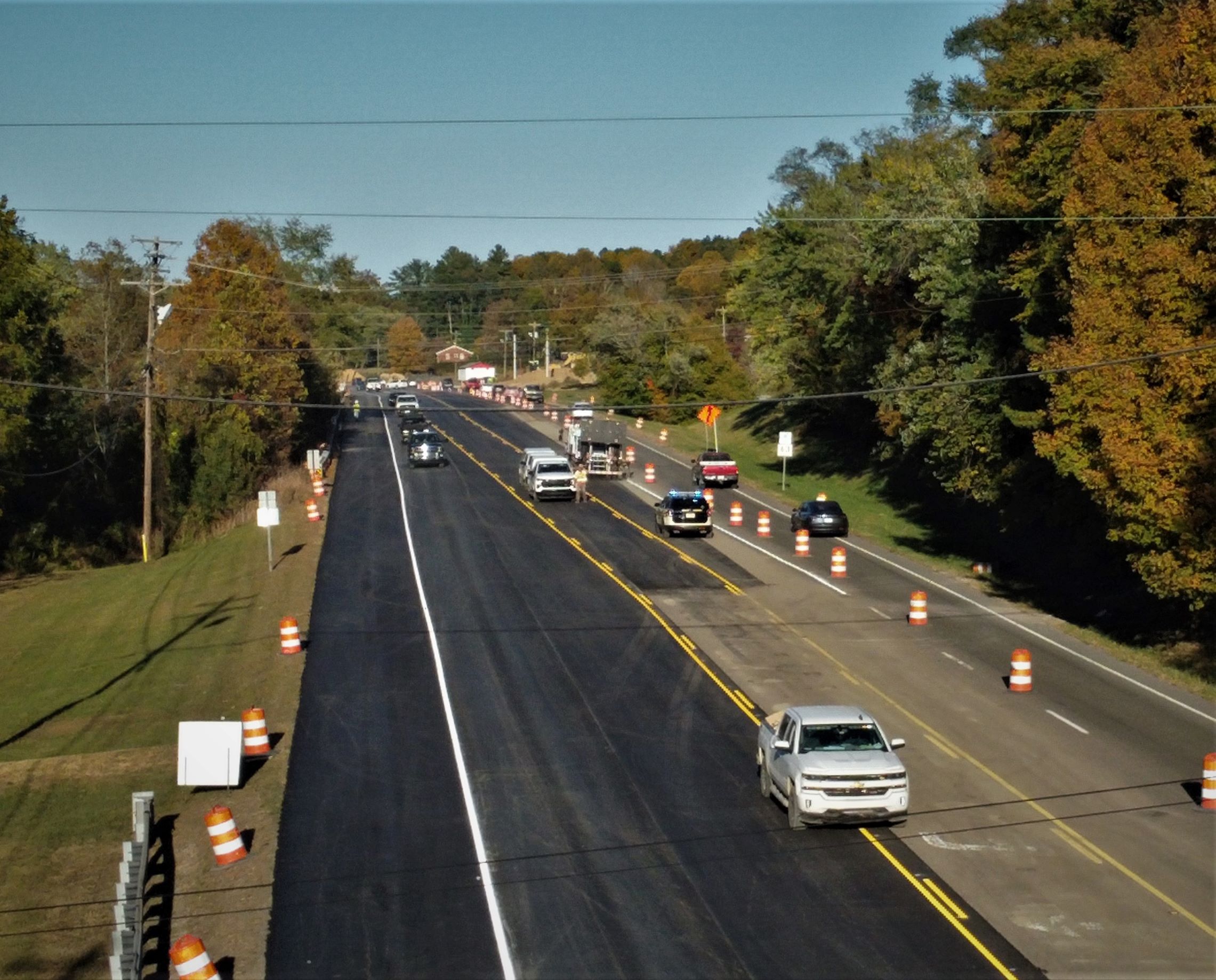 Middlesboro Road near the T-DOT office is now a straight road instead of a switch over.A turn lane was installed at Myers Lane (Food Lion) on Monday afternoon.Traffic now has been shifted to the north side of Hwy 63 from near the DeRoyal Industries Factory to near the Frontier Store further east a few miles.Traffic was backed up behind the paint truck spraying the new lane line.
