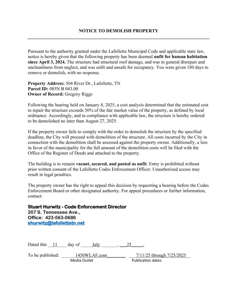 LAFOLLETTE, TN. (WLAF)- Pursuant to the authority granted under the Lafollette Municipal Code and applicable state law, notice is hereby given that the following property has been deemed unfit for human habitation since April 3, 2024. The structure had structural roof damage, and was in general disrepair and uncleanliness from neglect, and was unfit and unsafe for occupancy.