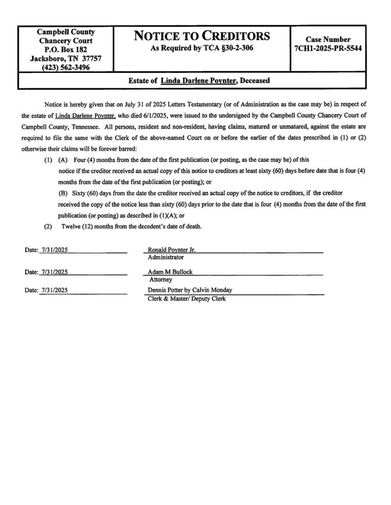 JACKSBORO, TN. (WLAF) -Notice is hereby given that on July 31 of 2025 Letters Testamentary (or of Administration as the case may be) in respect of the estate of Linda Darlene Poynter, who died 6/1/2025, were issued to the undersigned by the Campbell County Chancery Court of Campbell County, Tennessee.