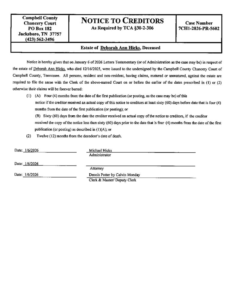 JACKSBORO, TN. (WLAF)- Notice is hereby given that on January 6 of 2026 Letters Testamentary (or of Administration as the case may be) in respect of the estate of Deborah Ann Hicks, who died 12/16/2025, were issued to the undersigned by the Campbell County Chancery Court of
