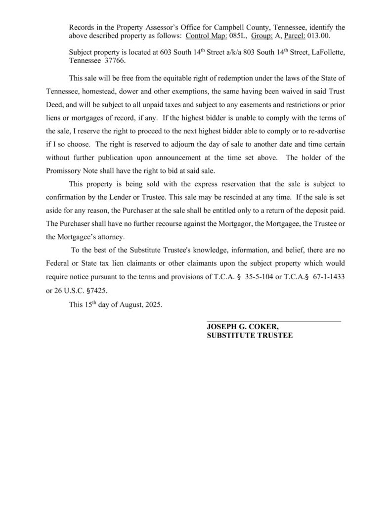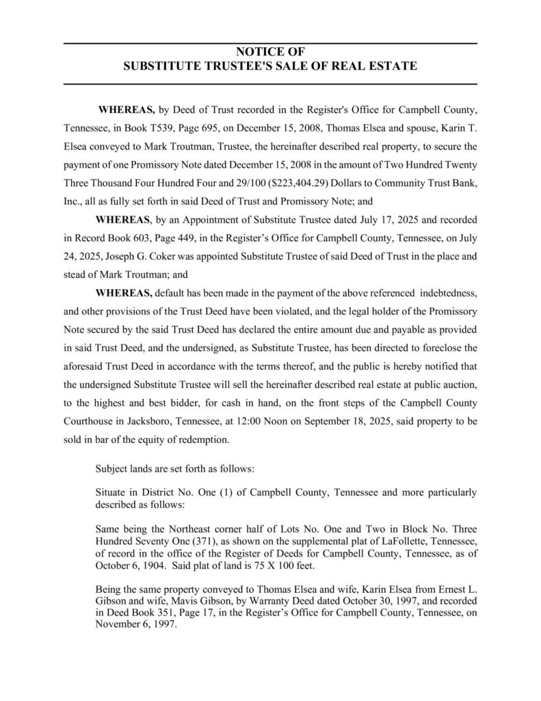 CAMPBELL COUNTY, TN. (WLAF)- WHEREAS, by Deed of Trust recorded in the Register’s Office for Campbell County, Tennessee, in Book T539, Page 695, on December 15, 2008, Thomas Elsea and spouse, Karin T. Elsea conveyed to Mark Troutman, Trustee, the hereinafter described real property, to secure the payment of one Promissory Note dated December 15, 2008 in the amount of Two Hundred Twenty Three Thousand Four Hundred Four and 29/100 ($223,404.29) Dollars to Community Trust Bank, Inc., all as fully set forth in said Deed of Trust and Promissory Note; and