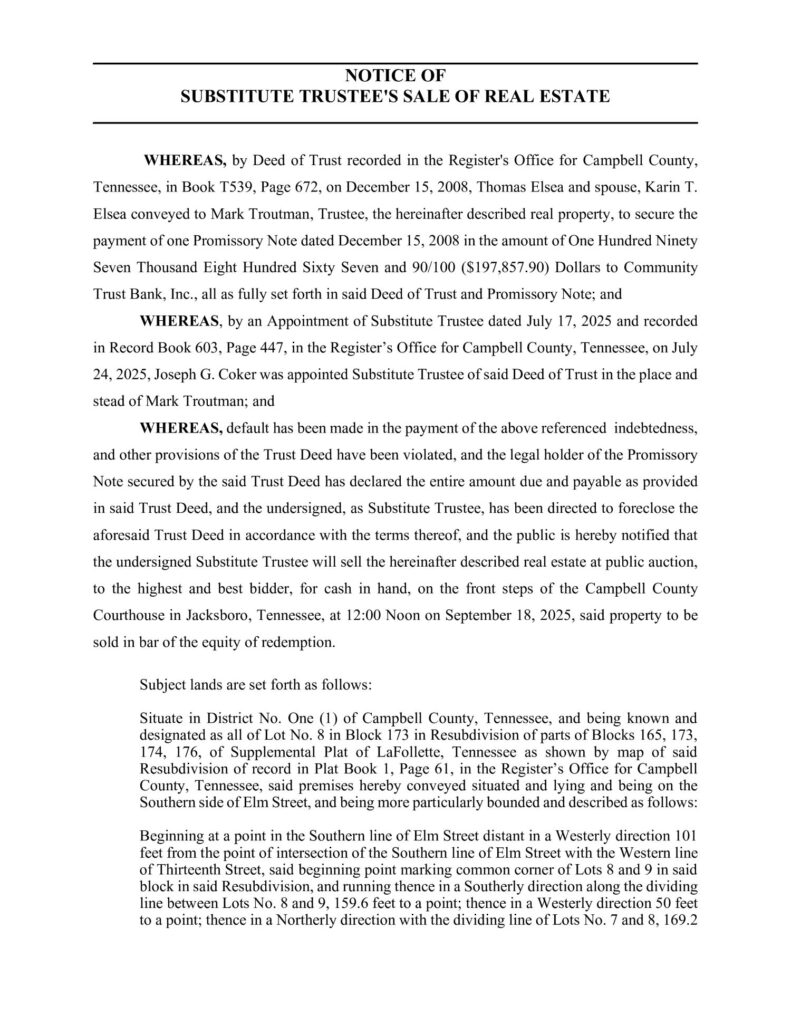 CAMPBELL COUNTY, TN. (WLAF)- WHEREAS, by Deed of Trust recorded in the Register’s Office for Campbell County, Tennessee, in Book T539, Page 672, on December 15, 2008, Thomas Elsea and spouse, Karin T. Elsea conveyed to Mark Troutman, Trustee, the hereinafter described real property, to secure the payment of one Promissory Note dated December 15, 2008 in the amount of One Hundred Ninety Seven Thousand Eight Hundred Sixty Seven and 90/100 ($197,857.90) Dollars to Community Trust Bank, Inc., all as fully set forth in said Deed of Trust and Promissory Note; and