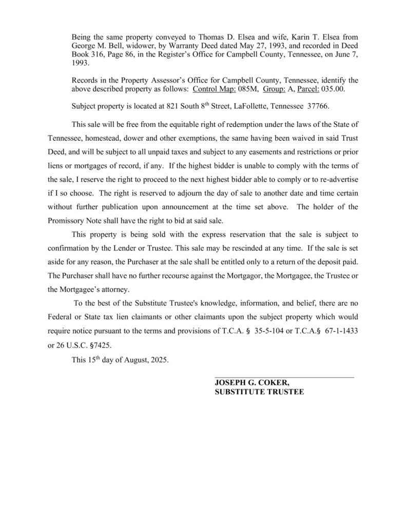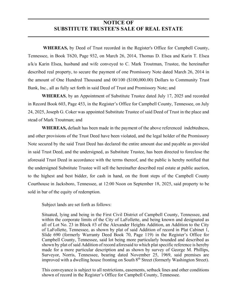 CAMPBELL COUNTY, TN. (WLAF)-WHEREAS, by Deed of Trust recorded in the Register’s Office for Campbell County, Tennessee, in Book T620, Page 932, on March 26, 2014, Thomas D. Elsea and Karin T. Elsea a/k/a Karin Elsea, husband and wife conveyed to C. Mark Troutman, Trustee, the hereinafter described real property, to secure the payment of one Promissory Note dated March 26, 2014 in the amount of One Hundred Thousand and 00/100 ($100,000.00) Dollars to Community Trust Bank, Inc., all as fully set forth in said Deed of Trust and Promissory Note; and