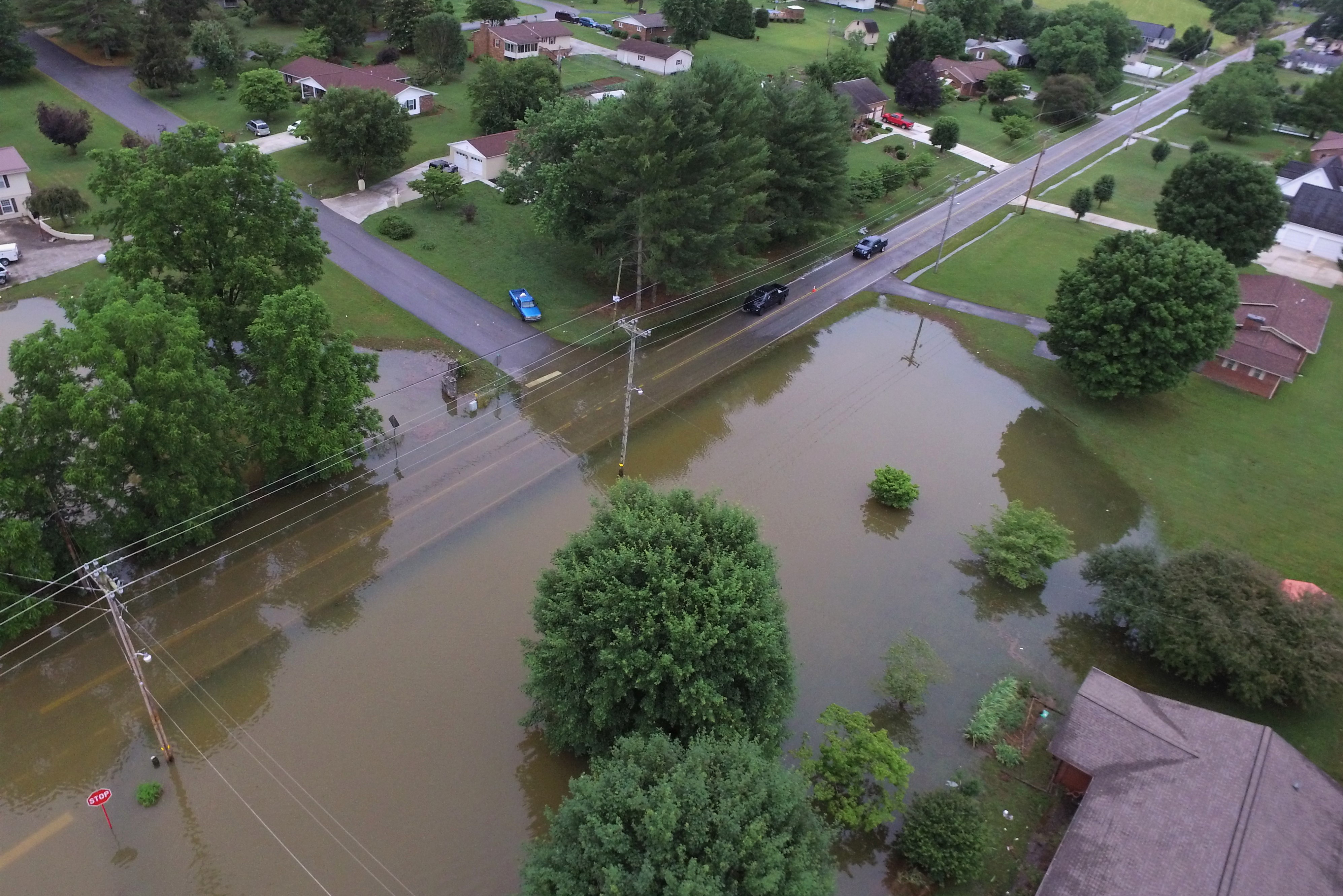 LAFOLLETTE, TN  (WLAF) – WLAF’s Charlie Hutson snapped some photos Saturday afternoon from Eagle I high above the flood waters of Old Middlesboro Hwy at Village East,  Howard Road and Locust Drive.  (WLAF NEWS PUBLISHED – 06/08/2019-5PM)