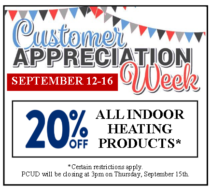 All indoor heating products will be 20 percent off Mon., Sept. 12 through Fri., Sept. 16. Hunley said PCUD will also install the product and offers 0% financing added directly to the monthly gas bill.