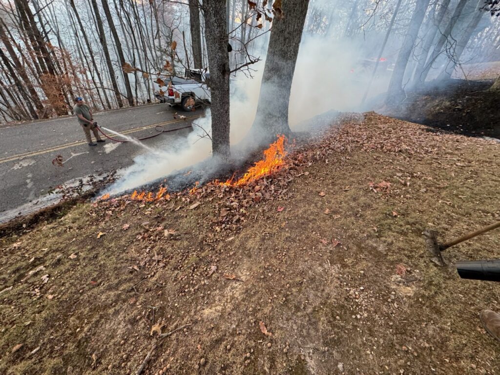 CCRFS Firefighter Brad Young finishes up putting out a leaves and mower fire.