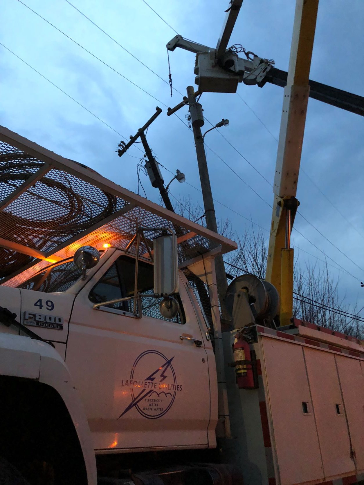 TOP PHOTO: A planned power outage took place Wednesday at 6:38am and is affecting about 30 LUB customers in the homes and businesses near WLAF on North 5th Street. This LUB crew is working on lines on West Walden Street.