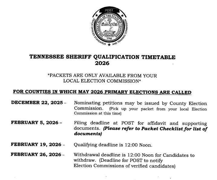JACKSBORO, TN (WLAF)- This is the 2026 Tennessee Sheriff Qualification Timetable for candidates who are running for Sheriff in 2026.