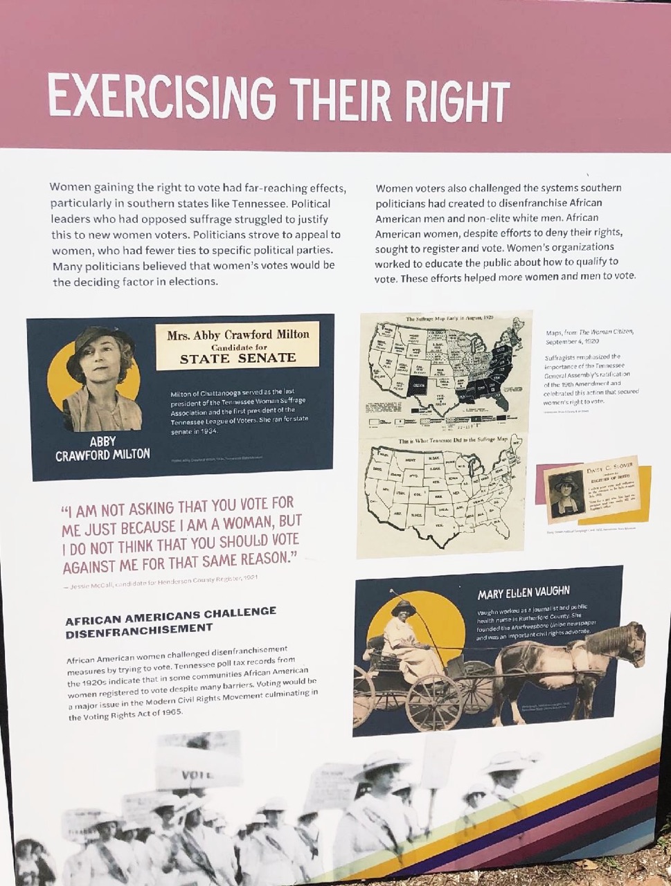 Watch for this historical display featuring the story of women’s suffrage in Tennessee. The exhibit is being sponsored locally by non profit Postmark LaFollette.