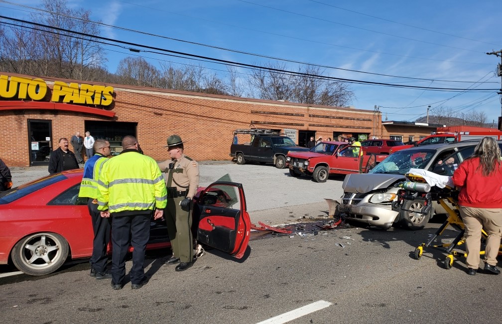 TOP PHOTO: This is the scene of the crash where a car and a van hit head on on the four lane across from the Woodson Shopping Center. It happened in the noon hour on Monday, December 20.