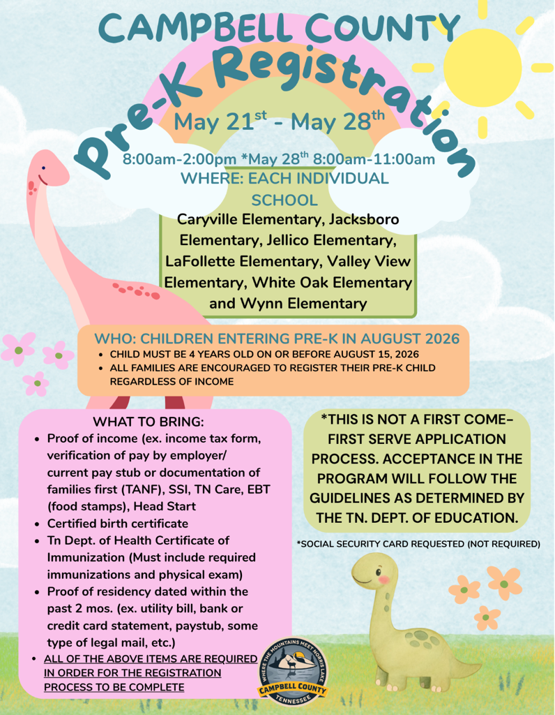 CAMPBELL COUNTY, TN (SPECIAL TO WLAF)- Come May is your opportunity to register your child for Pre-K in Campbell County Schools. Your student must be four years old before or by August 15, 2026.