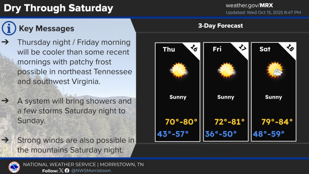 Drier and cooler conditions return by Monday, followed by a warming trend and possible showers and storms mid-week. (WLAF NEWS PUBLISHED-10/16/2025-6AM-IMAGE AND SOME TEXT COURTESY OF THE NWS MORRISTOWN)