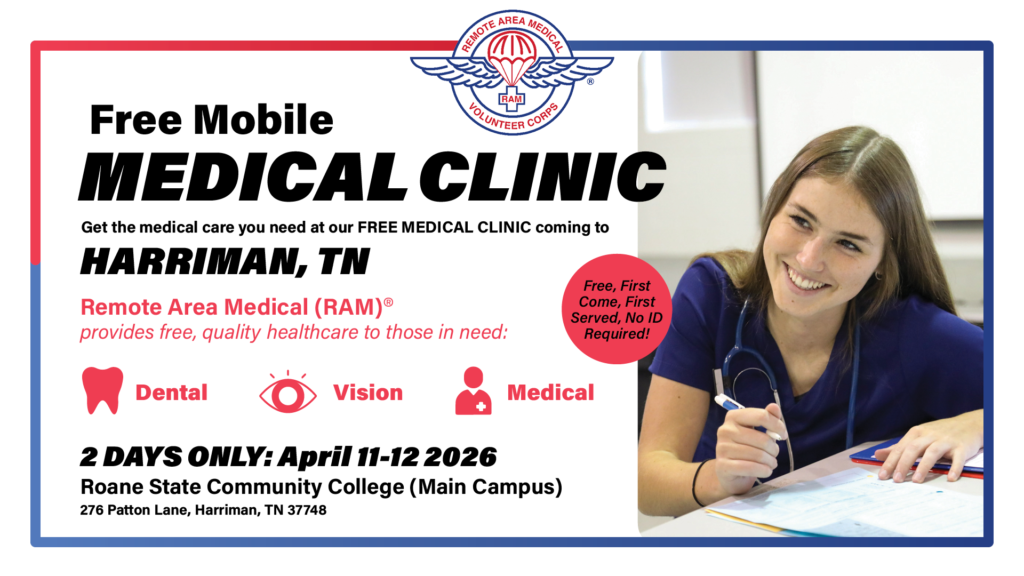 HARRIMAN, TN (SPECIAL TO WLAF)– For millions of Americans, access to basic healthcare is a challenge at best and an impossibility at worst. Due to geographic or economic barriers, much of the U.S. population is uninsured or underinsured. Remote Area Medical (RAM®) is stepping in to address this issue by offering a free, comprehensive dental, vision, and medical clinic at Roane State Community College Harriman Campus Clinic located at 276 Patton Lane, Harriman, Tennessee, on Sat. and Sun., April 11-12. This upcoming clinic will provide dental, vision, and medical care to those who might otherwise go without these essential services. This free RAM Clinic is hosted by Free Medical Clinic of Oak Ridge.