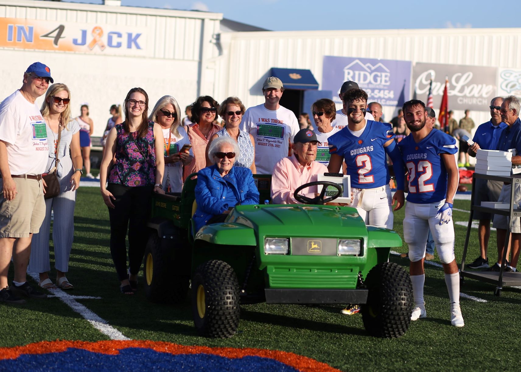TOP PHOTO: Jack Reynolds and his wife Mary Lou are recognized at center field on dedication night of John T. “Jack” Reynolds Field August 27, 2021. (PHOTO COURTESY OF WLAF’S PAT PEBLEY)