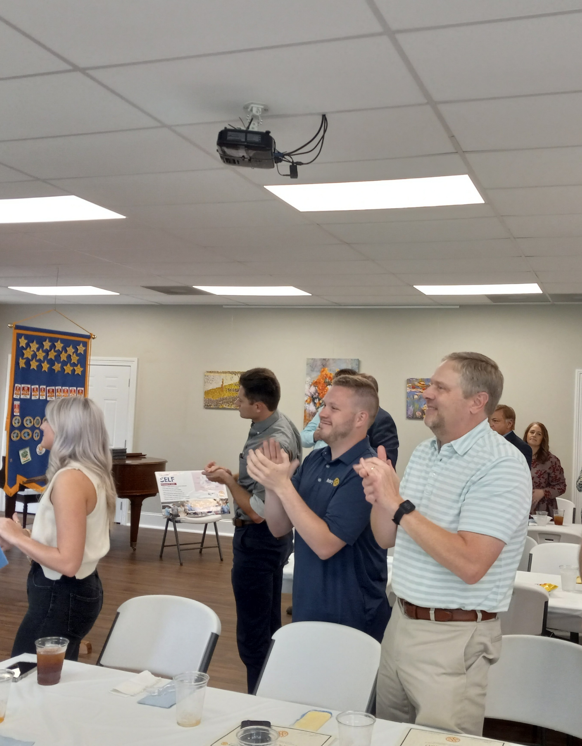 TOP PHOTO: New South Campbell County Rotary Club President Brandon Johnson, left and Rotarian Kenny Baird clap for outgoing Rotary Club President David Hickman as he concluded his term at Tuesday’s South Campbell County Rotary Club luncheon.