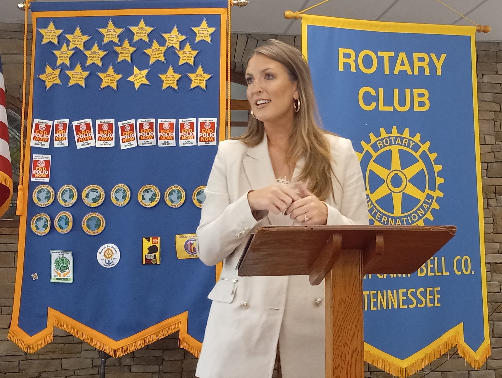 LAFOLLETTE, TN (WLAF) – Chelsea Ivens with Sen. Marsha Blackburn’s Office is from White Pine in Jefferson County, and is Blackburn’s senior field director. She manages the Senator’s public outreach for the Knoxville office and oversees the entire East Tennessee region. Ivens spoke at Tuesday’s South Campbell County Rotary luncheon and meeting.