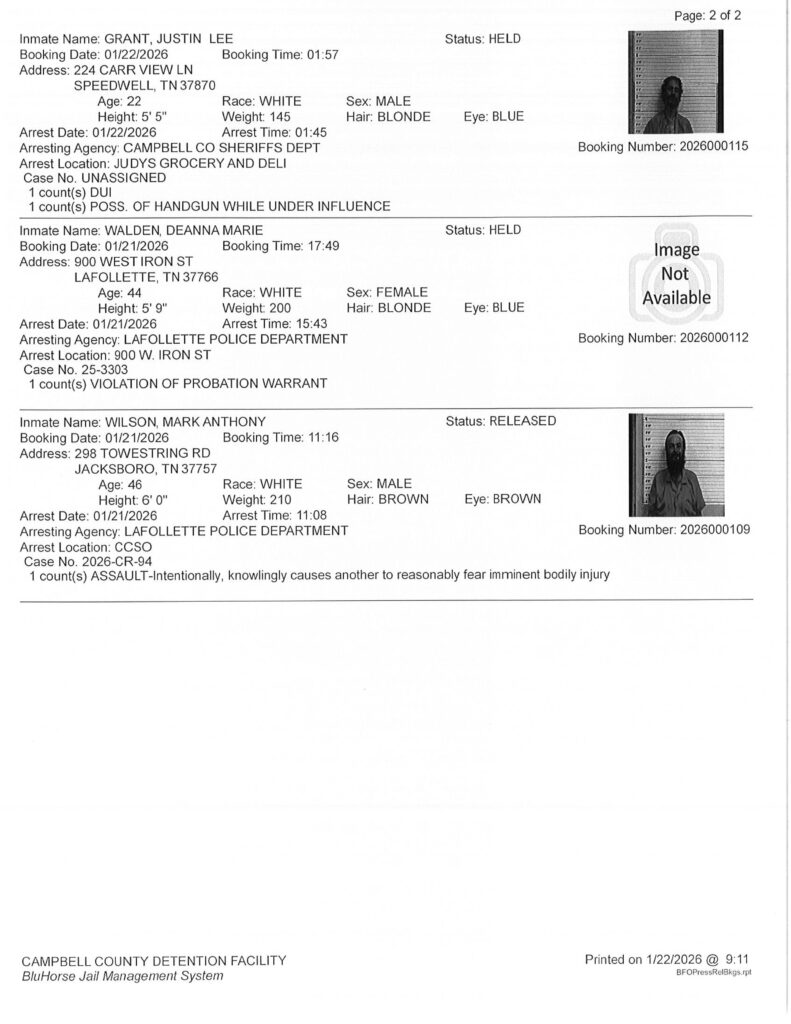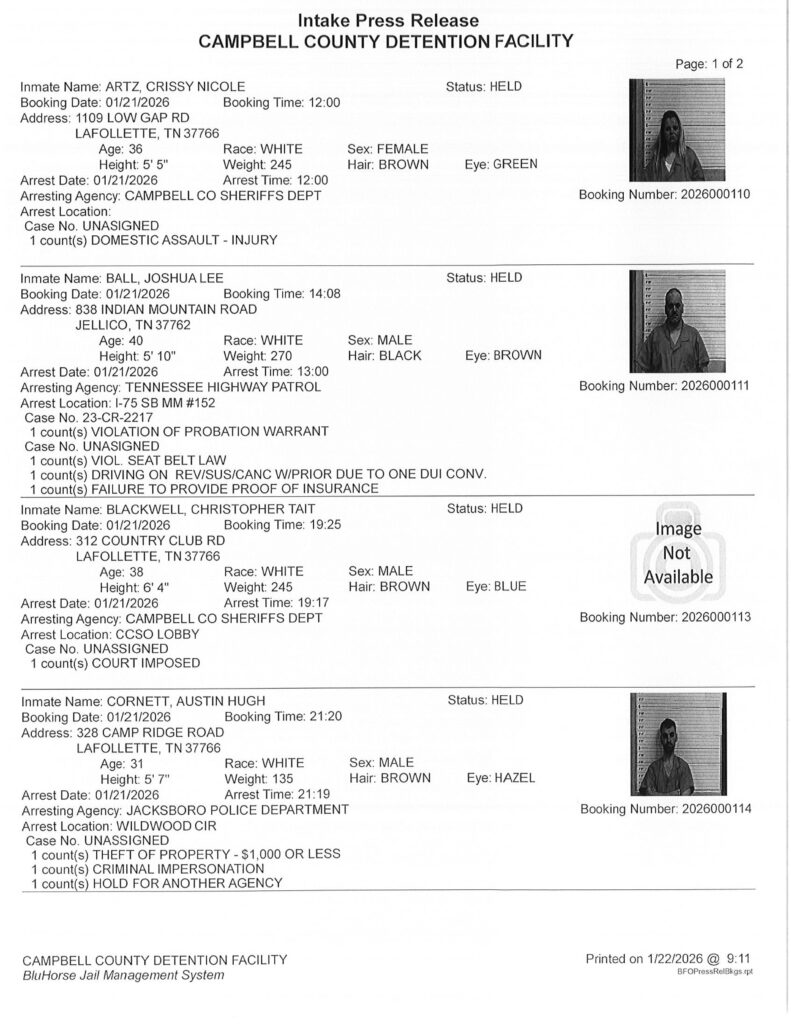- There are 22 names on the Tue., Jan. 20, 2026, B.C. Bonding Arrest Report. B.C. Bonding 423-563-0065.