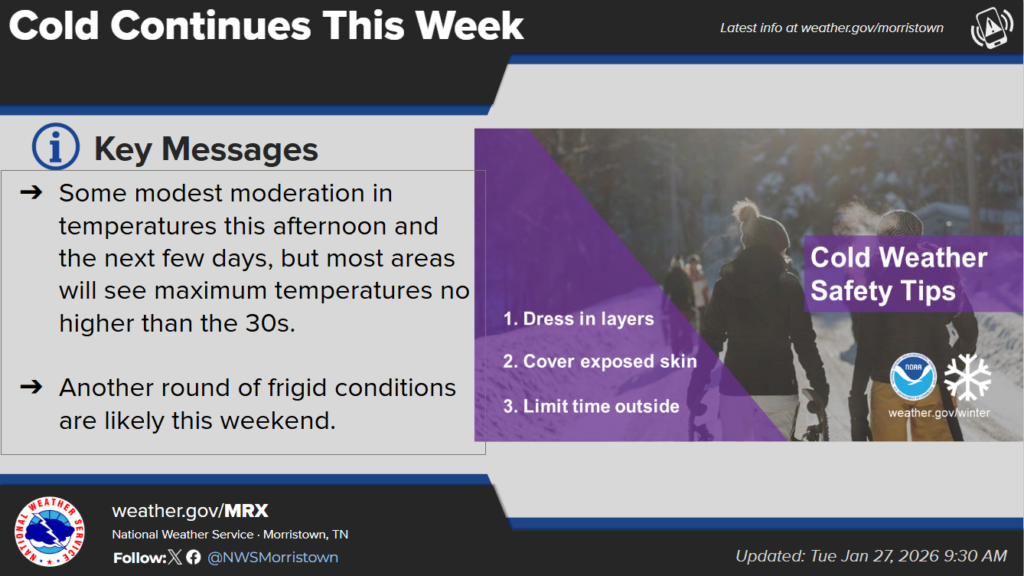 Another surge of bitter cold air is likely Friday night into the weekend. Moderate probabilities are in place for some minor snow accumulations across portions of Southwest Virginia, Northeast Tennessee and the East Tennessee mountains including Campbell County. (WLAF NEWS PUBLISHED-01/28/2026-6AM-TEXT & IMAGES COURTESY OF THE NWS MORRISTOWN)