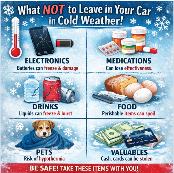 Pets run the risk of hypothermia when left in a vehicle in winter time. Cash and credit cards can be stolen. Perishable food items are also a no-no when it comes to the extreme cold.