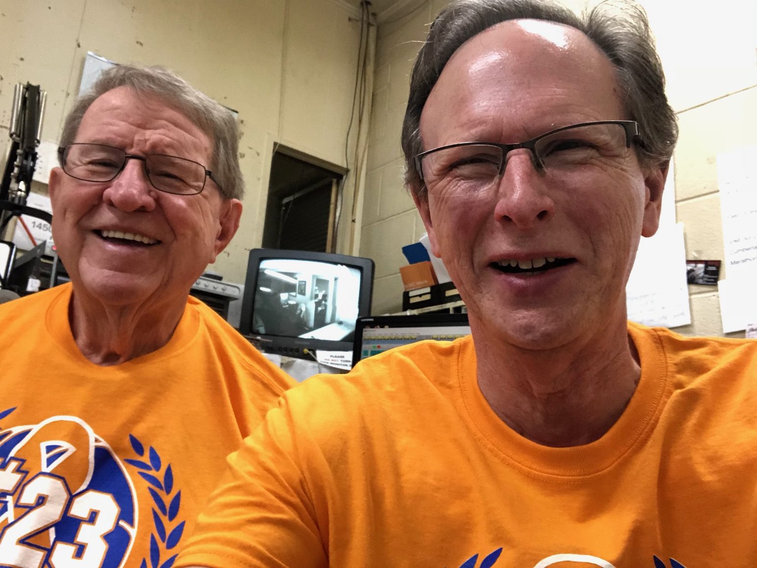 TOP PHOTO: The birthday celebration for Dalton Brown began early Friday morning at WLAF. WLAF’s Big Josh Etter (left) and Jim Freeman sport their new Team Dalton T-shirts.