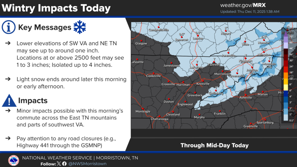 LAFOLLETTE, TN (WLAF)- Thursday morning temperatures will hover a shade above and a shade below the freezing mark creating slippery spots in areas that are seeing snow and sleet. Thursday’s skies slowly give-way to sunshine as temps hold in the 30s with cold wind chills.