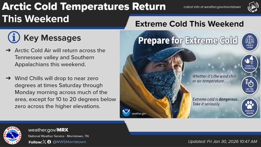 Sunday’s daytime temperatures will climb into the 20s as skies eventually give-way to sunshine. Forties for highs are ahead Monday. (WLAF NEWS PUBLISHED-01/31/2026-7AM-TEXT AND IMAGES COURTESY OF THE NWS MORRISTOWN)