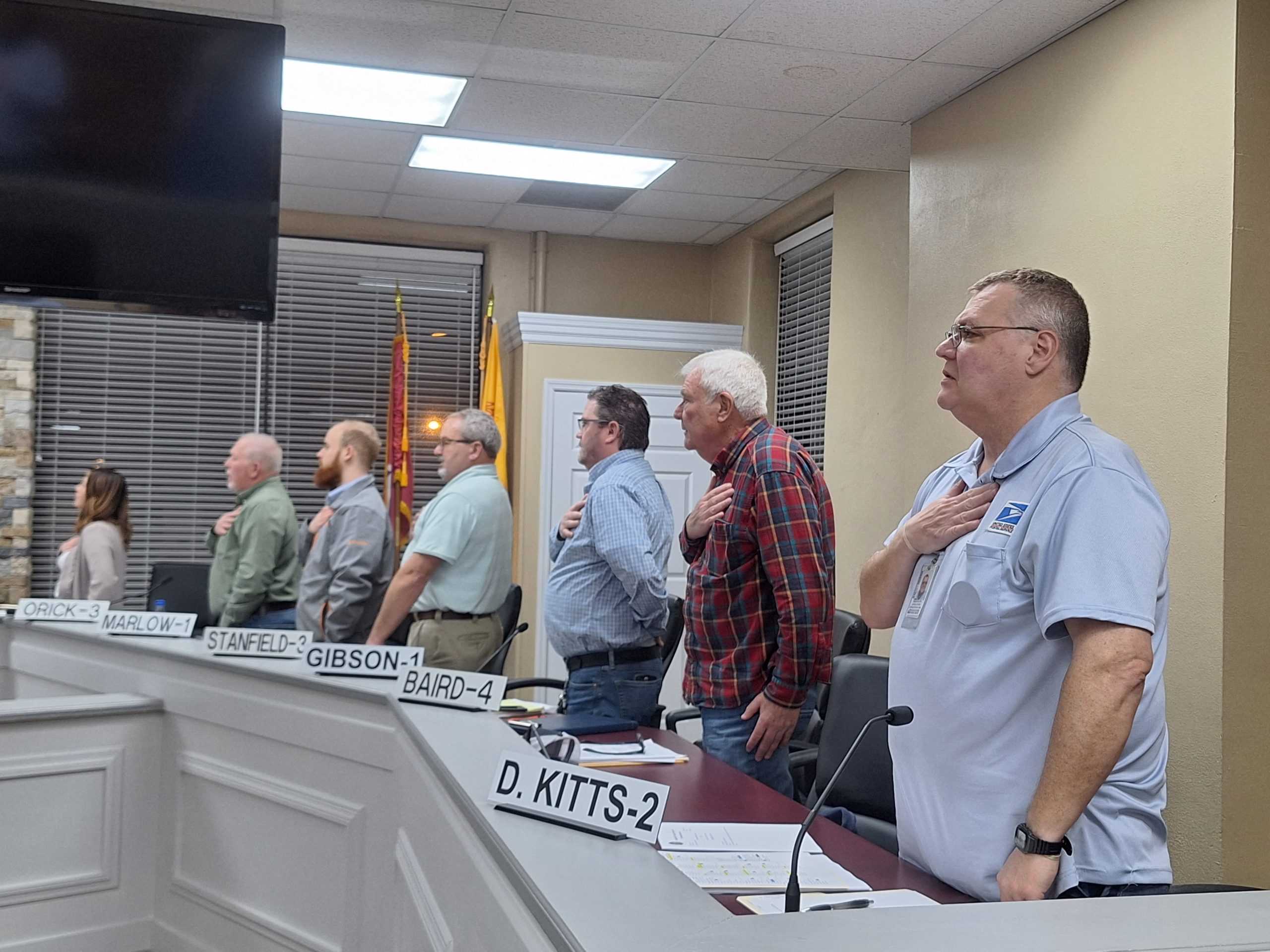 TOP PHOTO: County commissioners say the pledge of allegiance on Monday evening. During their workshop, commissioners discussed upcoming agenda items, including the sale of county industrial property.