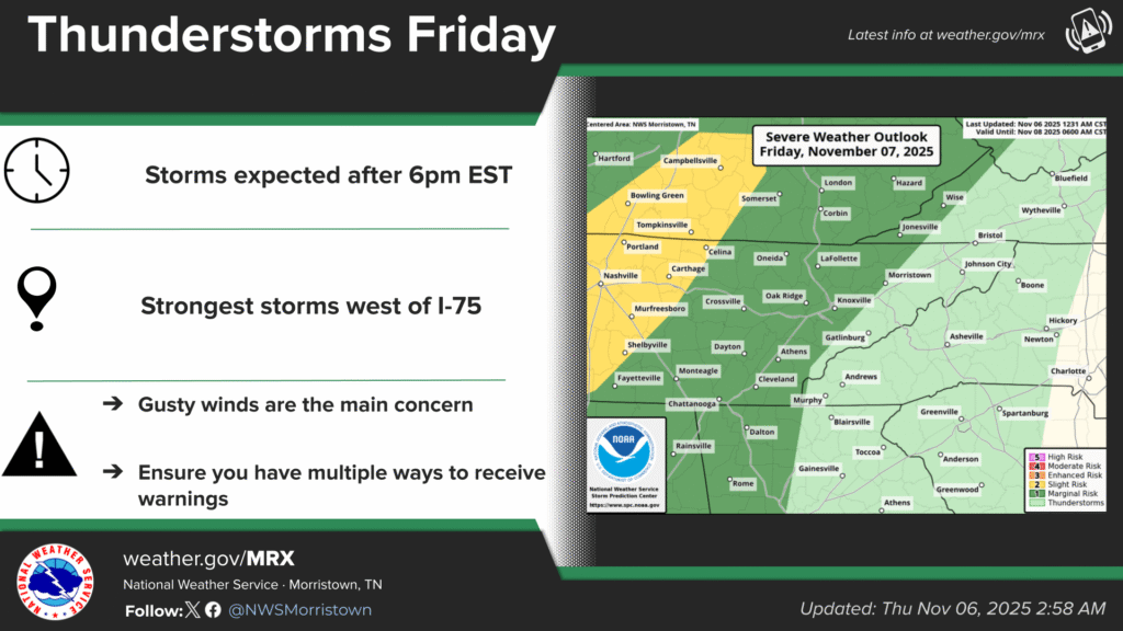 LAFOLLETTE, TN (WLAF)- Ahead of weather changes Friday and again Sunday into Monday, expect a pleasant day today with plenty of sunshine and a high of 63. It’ll be mostly clear and 43 Thursday night.
