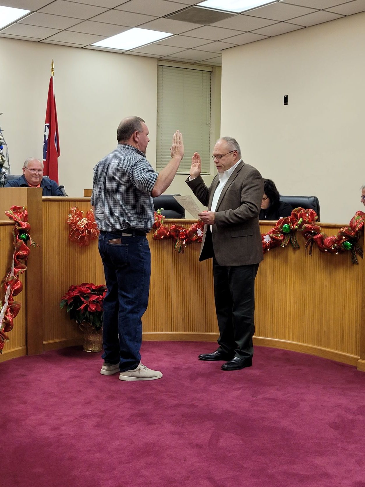 TOP PHOTO: Bryan St. John (left) was sworn in by City Administrator Stan Foust last December to fill a council seat until next month’s election.