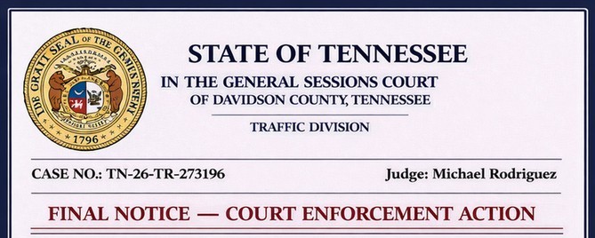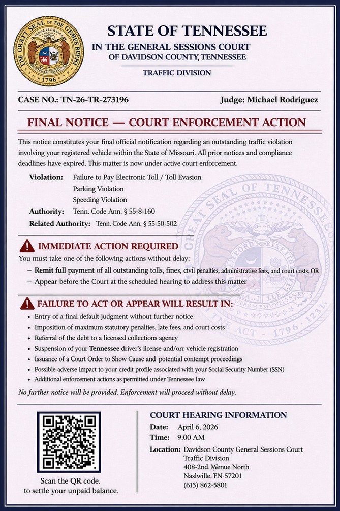 The sender wants you to “scan the QR code” or call the phone (613) area code number and pay your “fine”. All Nashville area codes are 615.