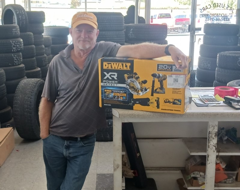 LAFOLLETTE, TN (WLAF) – The winner’s name for the latest grand prize from JR’s Tires was drawn Saturday morning. Since the spring, JR’s Tires has been giving away major prizes as well as cash prizes, and the giving continues in September. Jaylynn Kitts Malone drew from a whole lot of entries, and Cotton Collingsworth is the September winner of the DeWALT battery powered tool set which includes batteries and the charger.