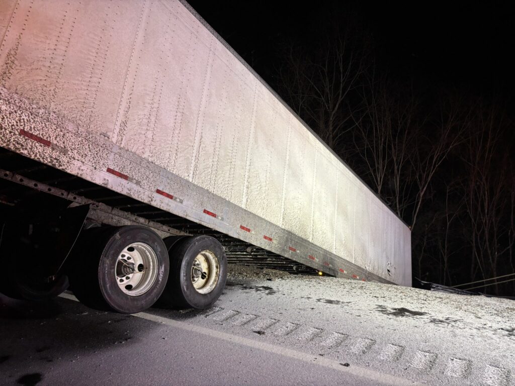 PIONEER, TN (WLAF)- Just after 10pm Sunday, a tractor-trailer jack knifed on a snowy-icy I-75 with the cab of the rig going over an embankment.