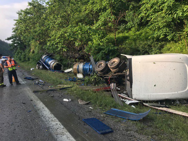 A big rig tanker jack-knifed in the 7 am hour this morning on I-75 here in Campbell County.  CLICK HERE to see the TDOT video.Officials with TDOT tell WLAF that the 18-wheeler was carrying copper sulfate, and that the approximately 4,500 gallon load spilled near Mile Marker 138 on the southbound side.  As of the noon hour, TDOT officials are saying that I-75 near the 138 MM will likely be down to one lane through Friday morning as the clean-up efforts continue. According to E-911 Dispatch and the THP, both lanes of I-75 are now open on Friday, June 1, 2018.