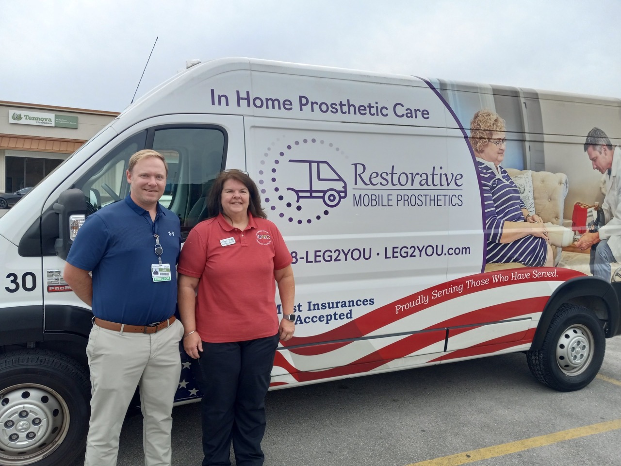 TOP PHOTO: Rehab Director and Doctor of Physical Therapy Chris Mathews and Certified Orthotist Regina Adcock stand in front of the mobile Orthotics and Prosthetics lab. Tennova-LaFollette Medical Center is now offering Orthotic and prosthetics services quarterly at its Woodson’s Mall location.