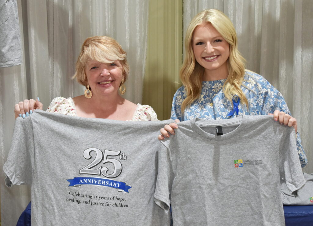Maggie Inscho and Kaylee Queener show off 25th year anniversary T-Shirts for the Children’s Center. To purchase one of these shirts, please call the center at 423.562.4190.