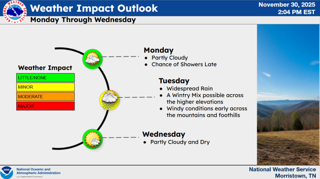 It’ll be dry Wednesday and Thursday with precipitation chances increasing once again Friday into the weekend. (WLAF NEWS PUBLISHED-12/01/2025-6AM-TEXT AND IMAGES COURTESY OF THE NWS MORRISTOWN)