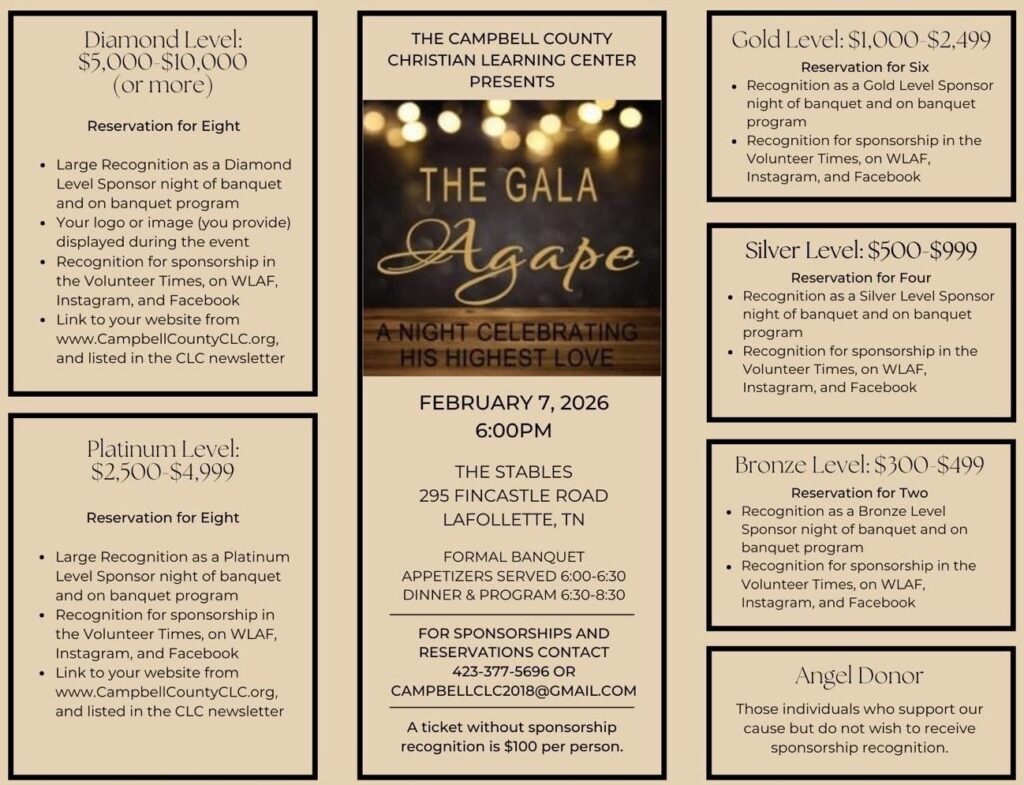 CAMPBELL COUNTY, TN (WLAF)- Now’s the time to get your tickets and make plans to attend the annual fundraiser for The Campbell County Christian Learning Center. The Gala Agape 2026 is Saturday, February 7, at 6pm at The Stables.