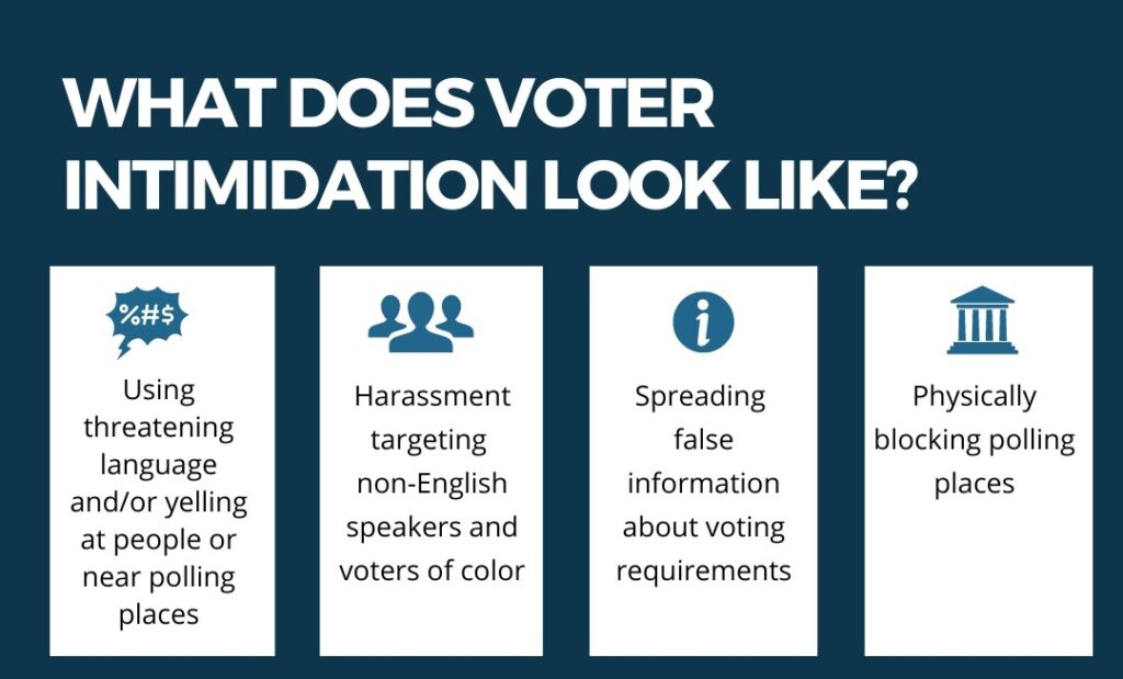 Attempting to sway an election with threats, intimidation, violence, force or restraint is a crime under state law. This extends to who a person does or does not vote for and if they vote or not.