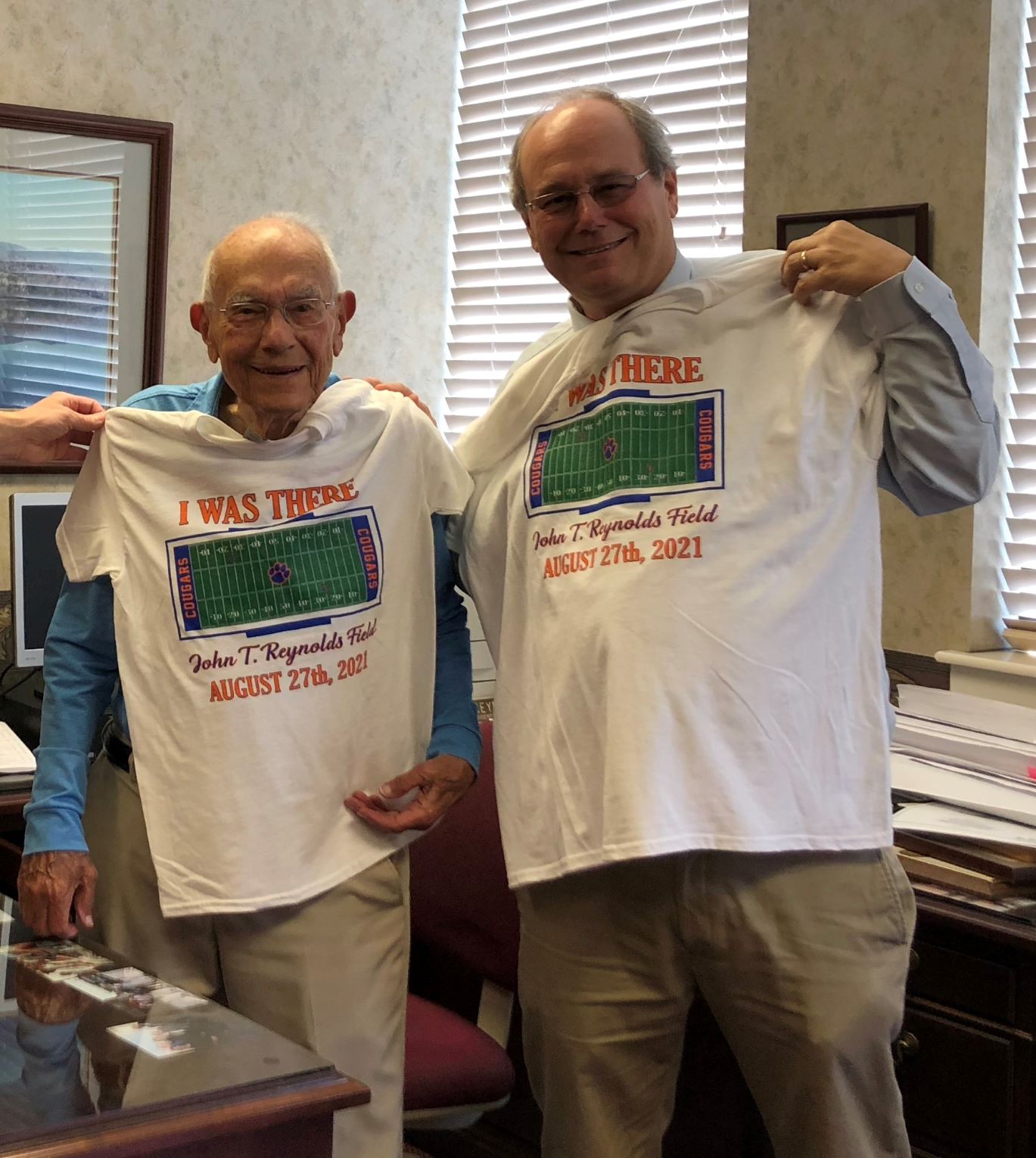 TOP PHOTO: For the first time, Jack Reynolds (left) and David Reynolds see the limited edition T-shirts commemorating the naming of the new Campbell High football field. The field was officially named John T. “Jack” Reynolds Field on Aug. 27.