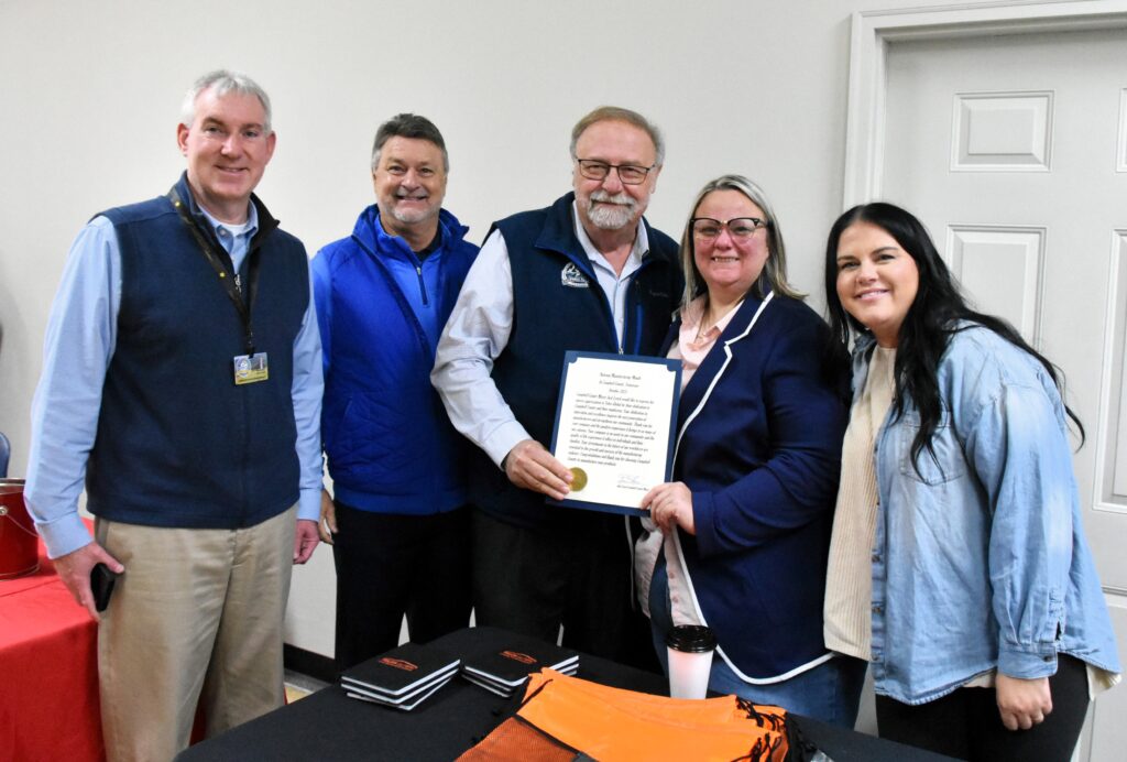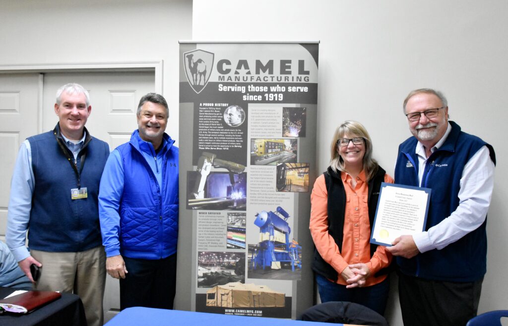 Campbell County Mayor Jack Lynch presented a special certificate to Kristin Schoenfelder with Camel Expeditionary in honor of National Manufacturing Month. On the left are Campbell County Vice-Mayor Randy Brown and Gary Human. Human is the East Tennessee Regional Director for the Tennessee Department of Economic and Community Development.