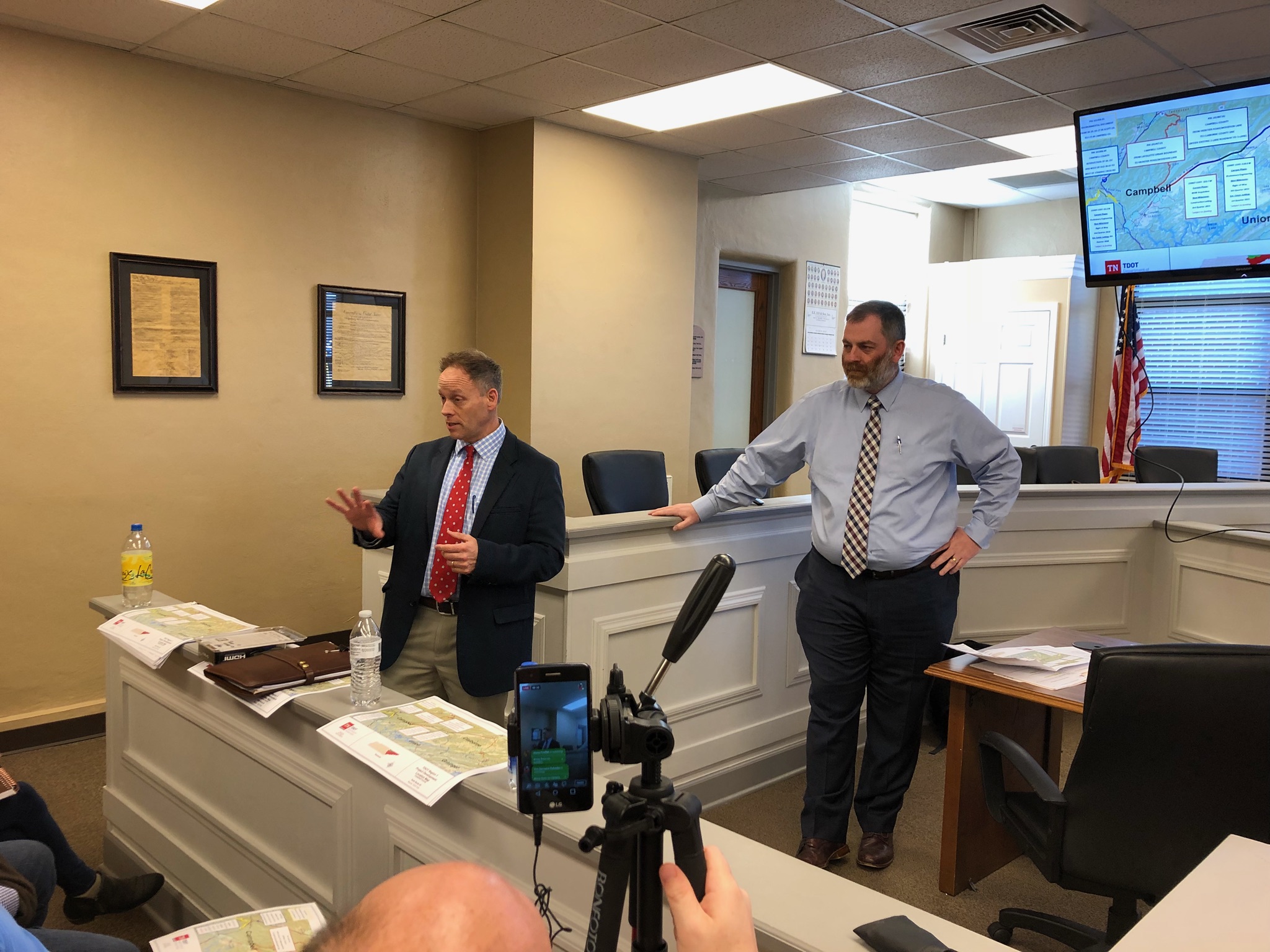 Pictured above are Steve Borden (L) and Dexter Justice (R), with TDOT’s Knoxville office, who hosted the get-to-gether. Borden is the Director/Assistant Chief Engineer of Region 1, overseeing the 24 county East Tennessee region, while Justice is the project development director for Region 1. Each listened, explained and answered questions to an audience that, at times, veered from the main topic.