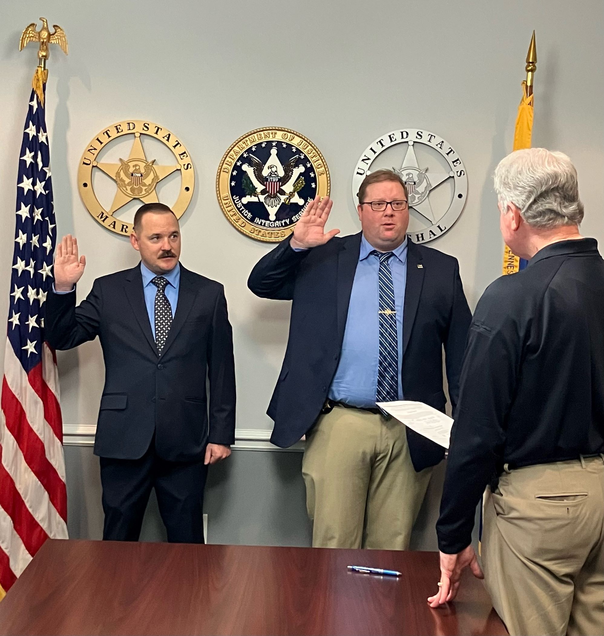 TOP PHOTO: Campbell County Deputies John Minor (left) and Matt Wasson were sworn in on Thursday morning to become members of the US Marshals Service Smoky Mountain Fugitive Task Force. “I want to thank David G. Jolley, the U.S. Marshal for the Eastern District of Tennessee, for swearing in John and Matt, two of our outstanding deputies,” said Campbell County Sheriff Wayne Barton.